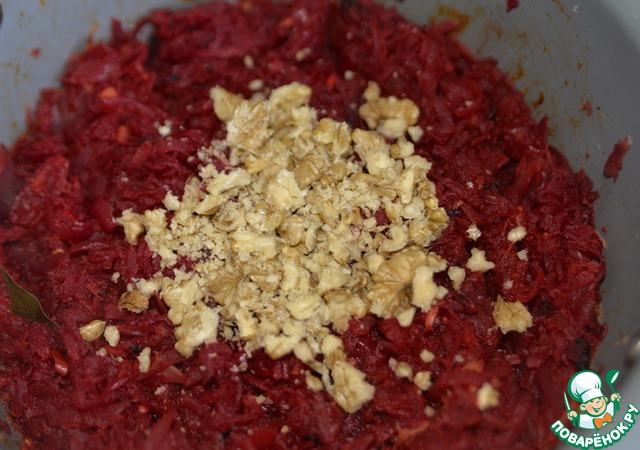 Добавляем дробленые грецкие орехи, перемешиваем. Даём закуске настояться и остыть.