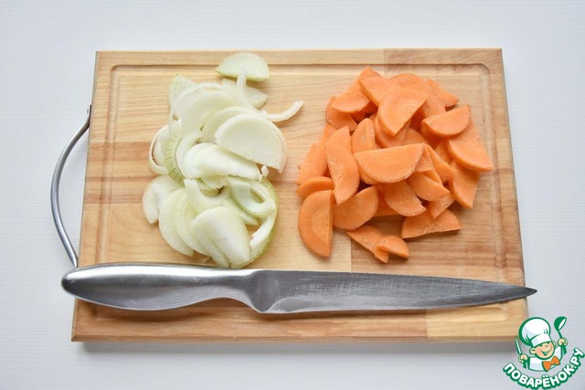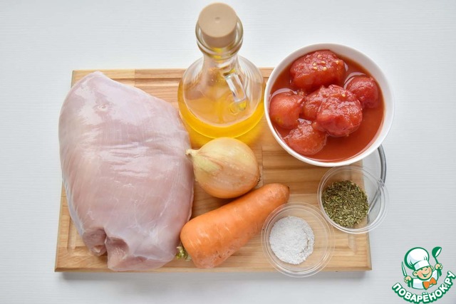 Подготовить продукты для начинки: мясо индейки, лук, морковь, растительное масло, соль, смесь прованских трав, черный молотый перец, томаты в с/ соку.