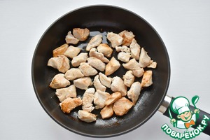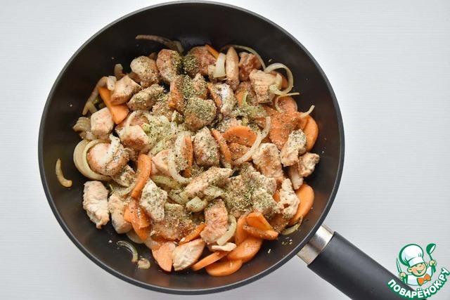 Добавить морковь и лук, соль, специи, всыпать небольшое количество сахара и обжарить овощи с мясом еще в течение пары минут.