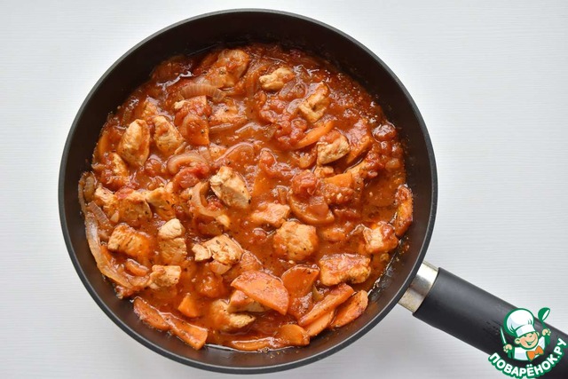 Добавить измельченные томаты без кожицы вместе с соком. Накрыть сковороду крышкой и уменьшить огонь до минимального. Томить минут 30, до загустения соуса.
