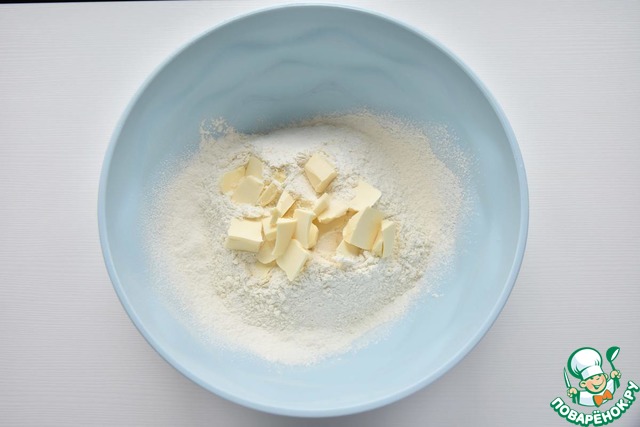 Муку смешать с разрыхлителем и просеять через сито. Добавить холодное сливочное масло, нарезанное ножом или натертое на терке.