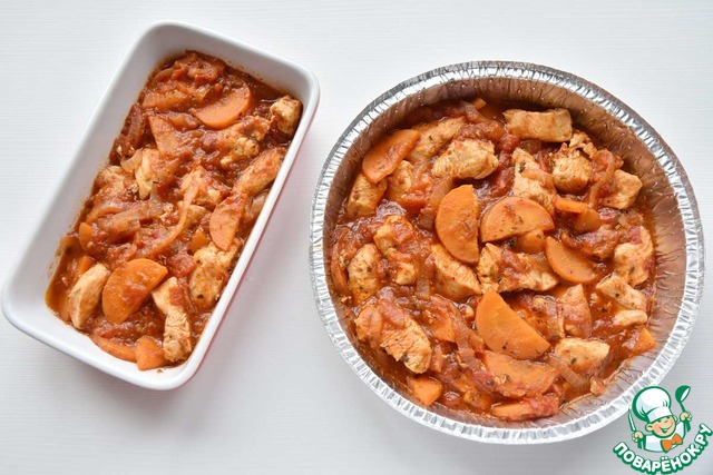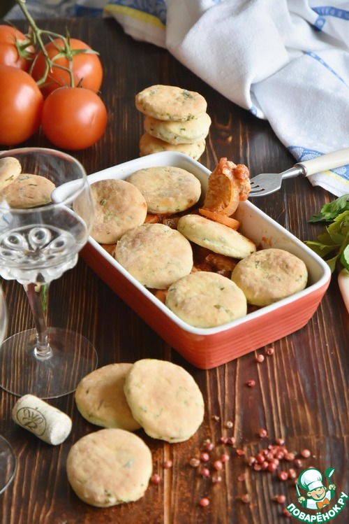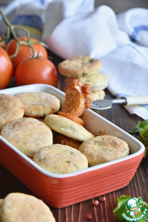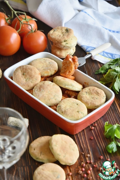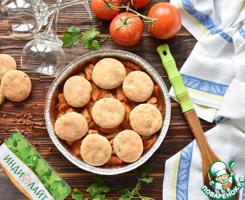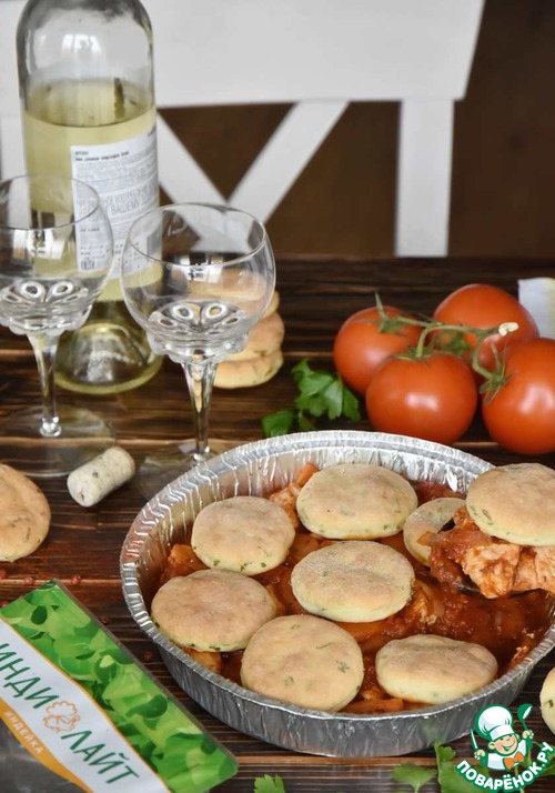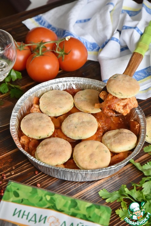Коблер это гибрид запеканки и пирога. Сочная начинка покрытая слоем из теста. Начинка может быть как сладкая (фруктово- ягодная) так и несладкая (мясо- овощная). Сегодня у меня коблер с нежнейшей индейкой, томленой с овощами в томатном соусе. Сверху ароматной подливы маленькие булочки из пресного теста с зеленью. Это блюдо универсальное. Его можно приготовить заранее, сложить в алюминиевую форму. Взяв с собой на пикник останется только разогреть блюдо на гриле, решетке или прямо на углях. Также коблер можно заморозить и разогреть по необходимости. На природе, среди родных, можно расслабиться, используя пресные булочки вместо столовых приборов, обмакивая их в густой ароматный мясной соус и наслаждаясь вкусом.