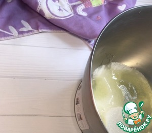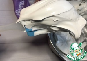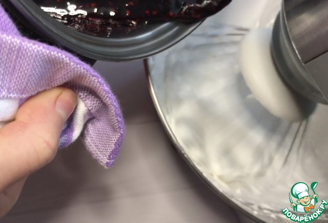 Смесь помешивая довести до кипения. После закипания проварить ещё 3 минуты. Вводим тонкой струйкой в взбивающийся белок
