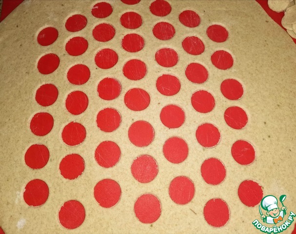 Меньшую часть тонко раскатать, вырезать маленькие кружки (я вооружилась минзуркой, которая прилагалась к сиропу от кашля). Тесто гладкое, приятное на ощупь, эластичное. Раскатывается легко.