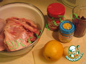 хорошенько смешиваем курочку, цедру, брусничное и грушевое пюре, имбирь, зелень, мускатный орех, соль и перчик и отправляем в холодильник мариноваться часов на 6 -