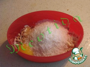 Смешиваем яйца, тертый сыр и кокосовую стружку в однородную массу, можно немного посолить и поперчить, после того, как курочка час постоит в духовке, заливаем ее сырно-кокосовой смесью и отправляем еще минут на 20 в духовку