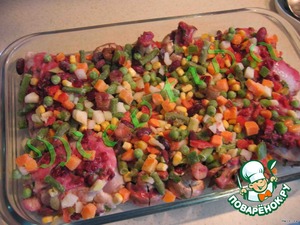 - Ассорти овощное (замороженное, у меня любимая смесь горошка, кукурузки и перчика) — 300 г