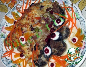 Вчера, возвращаясь вечером домой, вдруг почувствовала, как сердце защемило сладостных от воспоминаний о лете... о тех прекрасных теплых и солнечных денечках, которыми оно нас балует.. когда все вокруг все цветет.. зеленеет.. и воздух пропитан ароматом счастья.. так и хочется раскинуть руки и воспарить высоко-высоко в жаркое летнее небо и парить над землей, кружась в вихре медовых ароматов и солнечных лучей... вот и получилась у меня такая радостная и летняя курочка.. в клюквенно-грушевом маринаде с ароматными и пикантными специями.. с грибочками и яркими вкраплениями овощей. под сырно-кокосовой шапочкой...