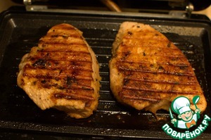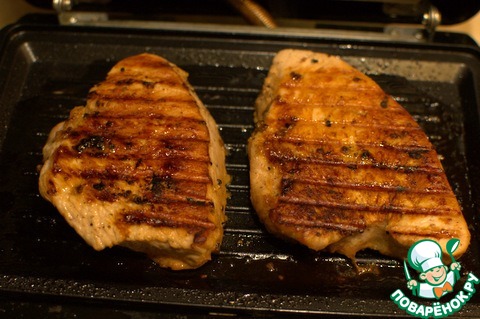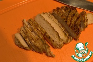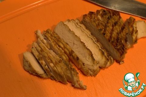 Замаринованную индейку солим по вкусу и обжариваем, затем оставляем "отдохнуть" минут на 10 под фольгой