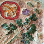 Выложить на поверхности фокаччи любой рисунок, используя сезонные овощи разного цвета, зелень, грибы, оливки, маслины, каперсы. Можно присыпать фокаччу крупной солью или смесью сухих трав.