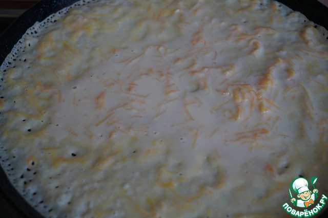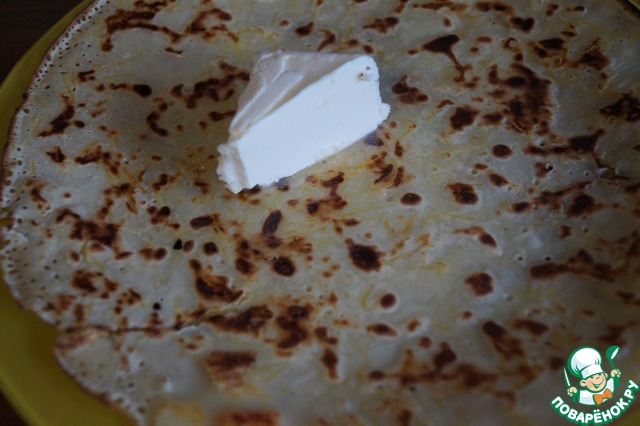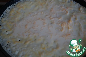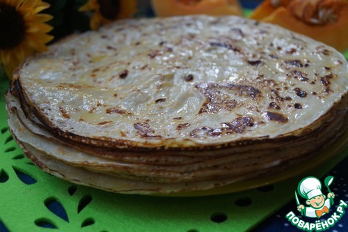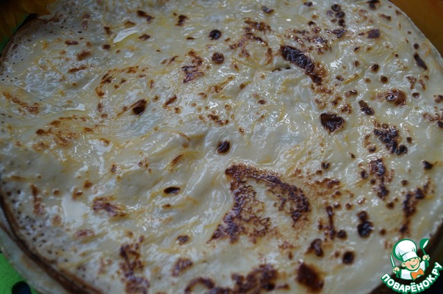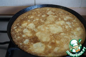 Сковороду для выпекания блинов смазать растительным маслом, хорошо ее разогреть и тонким слоем налить тесто.