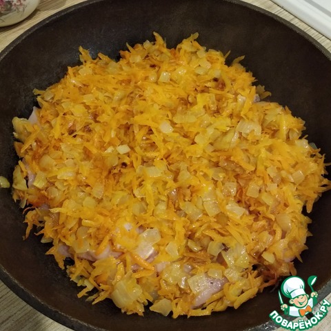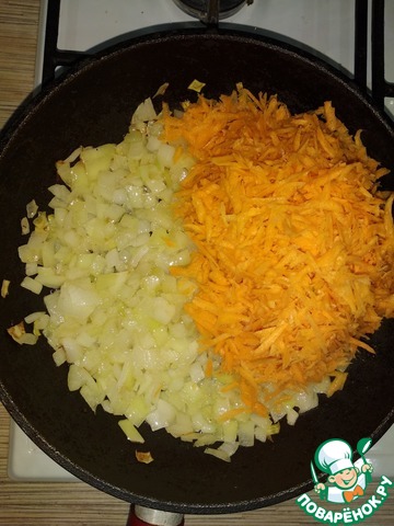 Лук немного солим, обжариваем до золотистого цвета, добавляем натертую морковь и тушим под закрытой крышкой.