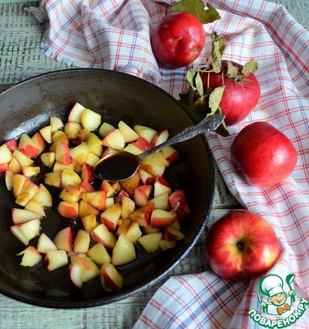 В сковороде разогреть топлёное масло, обжарить яблоки, огонь средний, 2-3 минуты. Влить мелассу, протушить ещё пару минут. Не перемешивайте интенсивно, встряхивая, старайтесь сохранить кусочки яблок.