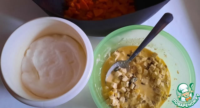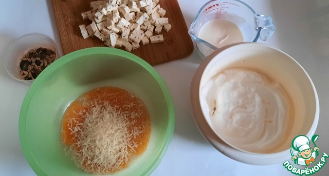 Пока печётся тыква, приготовить начинку. Яйца разделить на белки и желтки. К желткам натереть твёрдый сыр, мелко нарезаную брынзу, сметану и большую часть семечек, всё перемешать. Белки взбить с щепотка соли до лёгких пиков.