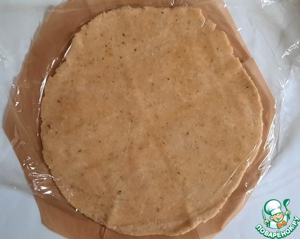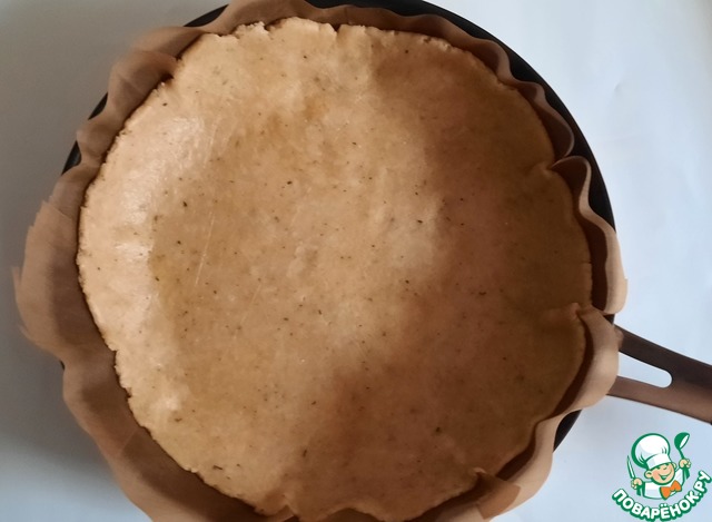 Перенести тесто в форму для киша, у меня такой нет, я воспользовалась сковородой диаметром 24 см. Тесто должно быть немного больше дна формы, на фото видно. Поставить в духовку, выпекать при 170 градусах 20 минут.