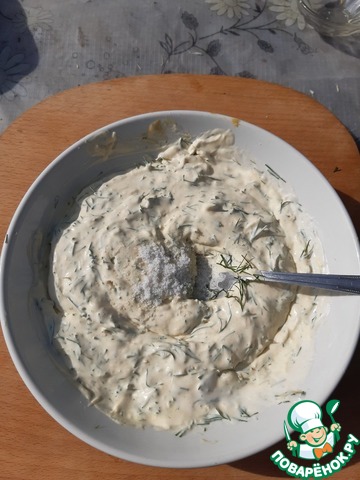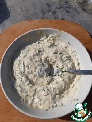 Выложить в миску сметану (у меня домашняя, сепараторная, очень жирная, я другую не люблю), но это дело вкуса - думаю подойдет и более жидкая. Добавить 2 ст. л майонеза (использовала майонез своего приготовления), 1 ст. л. горчицы, сахар, соль и зелень (по рецепту - петрушка, у меня был укроп)