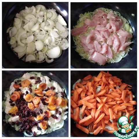 На природе плов готовят в казане. Я буду делать плов на газовой плите в воке D-28 см и высота-10 см. Включаем огонь на полный, ставим вок, выкладываем лук слоем и заливаем его подсолнечным маслом. ВАЖНО! Масло должно покрыть лук полностью. У меня улилось 175 мл (измеряла мерной кружкой). Обжариваем лук на сильном огне, постоянно мешая лопаткой, чтобы он не пригорел. Если у вас пригорит лук, это отразится на вкусе плова (он будет не вкусный). Лук золотим. Далее отправляем куски индейки, румяним их и кладём сухофрукты, перемешиваем. Обжариваем всё так же на сильном огне, постоянно помешивая. Очередь моркови. Теперь убавляем огонь на средний и обжариваем всё до полу-готовности.