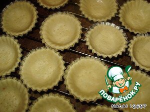Готовое тесто раскатать в пласт толщиной 2-3мм и вырезать кружочки по размеру формочек. Вырезанные кружочки уложить в формы, прижать тесто к внутренней поверхности форм, проколоть в нескольких местах.