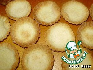 Заполнить горохом для сохранения формы и выпекать при 220-240С. Когда корзиночки подрумянятся, их вынуть из формочек, высыпать горох и охладить.