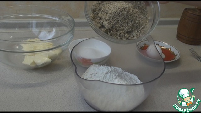 • Смешиваем все сухие ингредиенты: муку, сахар, соль, разрыхлитель и измельченные орехи. Хорошо перемешаем.
