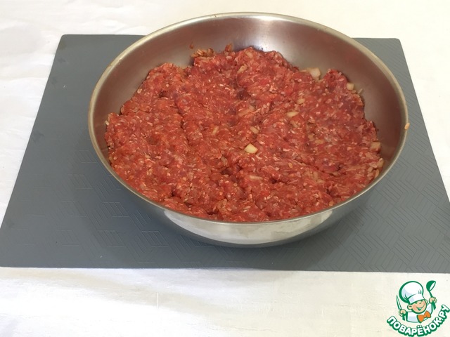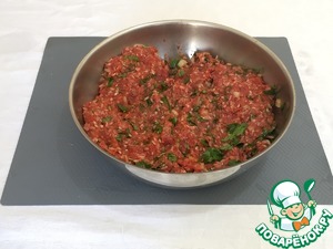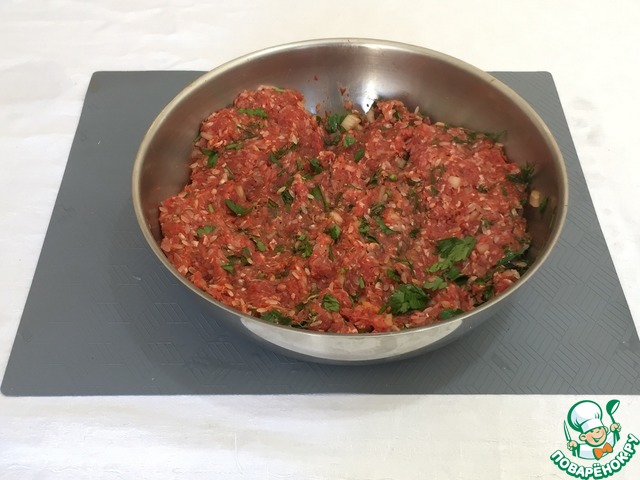 Добавляем рис, ч. л соли, черный перец, красный перец, ст. ложку томатной пасты, фарш из говядины и перемешиваем. -