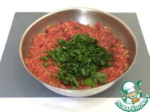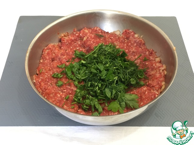 Далее мелко нарезаем укроп с петрушкой. Добавляем в фарш.