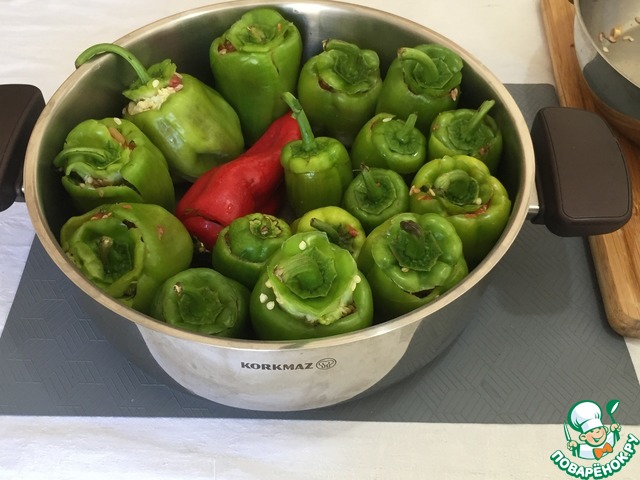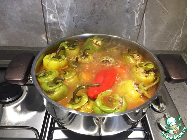 Перец моем и очищаем от семян. Наполняем его фаршем сверху закрываем хвостиком и выкладываем в кастрюлю.