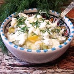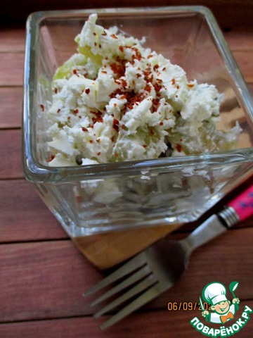 Рецепт этого салата я прочитала на болгарском кулинарном сайте "Веселият Готвач" и назывался он - "Млечна салата"Зимен ден", поэтому я так его и перевела. Очень вкусный и сытный салат. Хорош как закуска, но и сам по себе тоже самодостаточен.