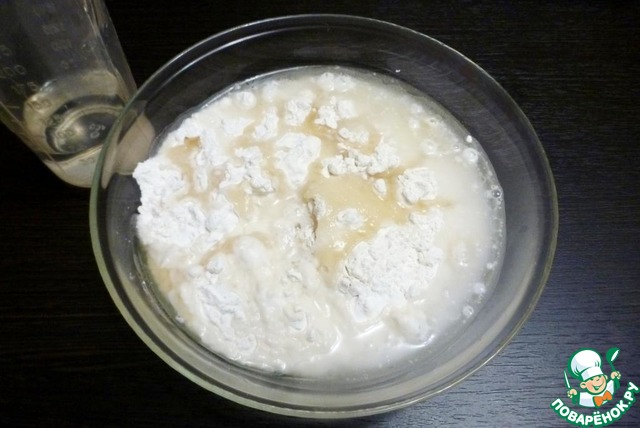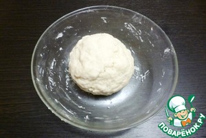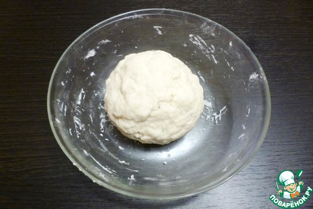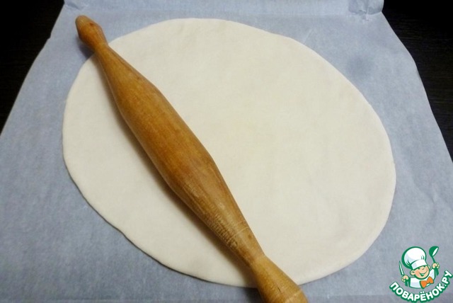 Раскатать тесто в тонкую лепешку, примерно как на пиццу. Я раскатываю на бумаге для выпечки, ничем её не смазываю.