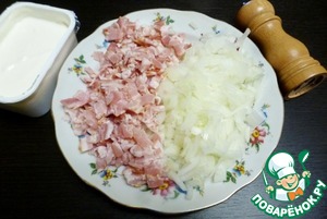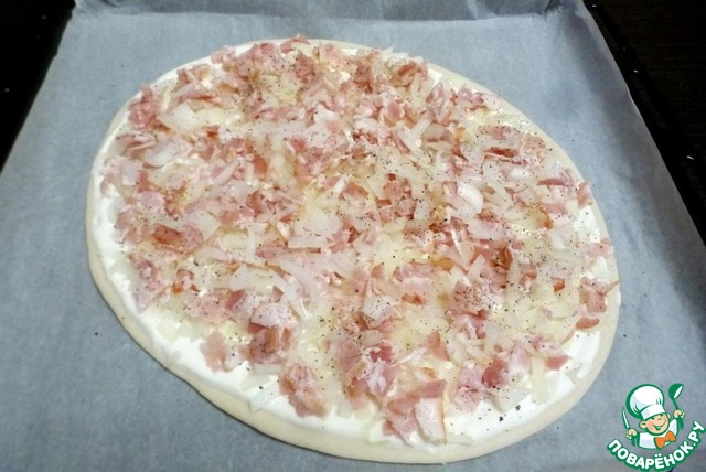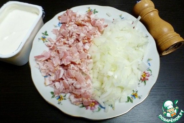 Сверху сметаны распределить нарезанные бекон и лук. Посыпать черным перцем.