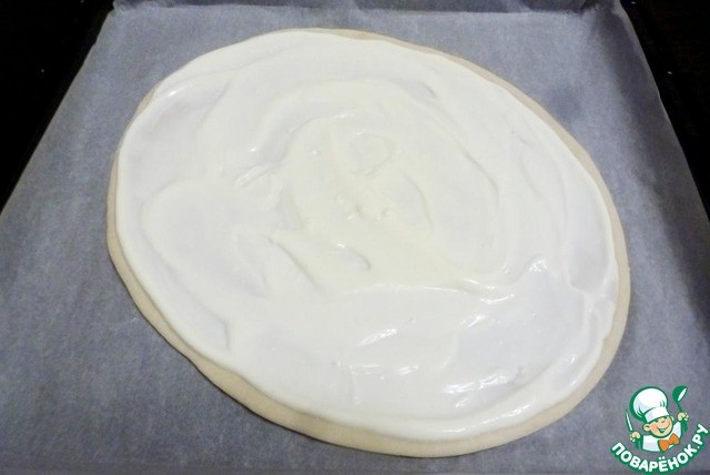 Смазать лепешку сметаной. Сметана должна быть жирной. Конечно, всё зависит от производителя и качества изготовления, но 15 % сметана может в процессе нагревания свернуться и у вас будет полный противень жидкости. А она тут совсем не нужна! Я так один раз пирог испортила.