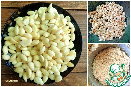 Снять верхнюю коричневую оболочку. Удобно это делать зажав острый конец орешка между тремя пальцами (большой, указательный и средний) сложенными макушечками вместе (щепотью). Можно облегчить процесс, надрезав, чуть – чуть «верхушку» орешка. Затем их обжарить на сковороде до зарумянивания или просушить в духовке при температуре 200 градусов десять минут. Измельчить орехи удобным способом, в данном случае я воспользовалась кофемолкой.