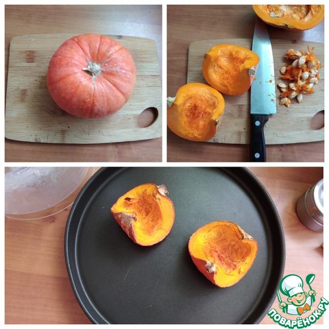Для пирога тыкву нужно запечь в духовке. Разрезала тыкву, вынула семечки. И половину ещё разрезала пополам. Вот 2 четвертушки я и запеку 10 минут при Т-170 С.