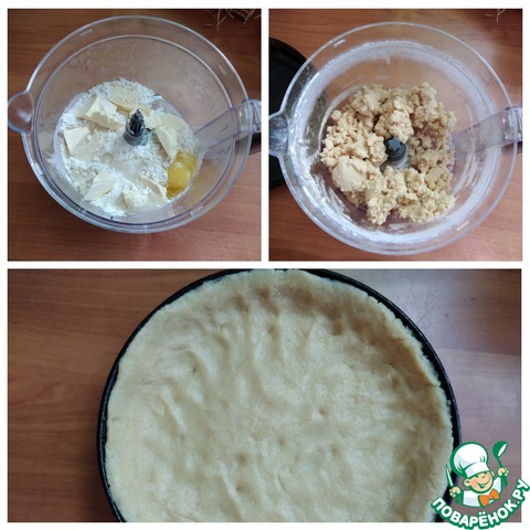 Пока тыква запекается, делаем тесто. Для замеса теста и заливки пирога я буду использовать комбайн (блендер, измельчитель). В чашу выложила всё сразу: сахар; масло; муку; яйцо и воду. Всё разбила в крошку. Руками обмяла, тесто чудесное и к рукам не пристаёт. Сформировала лепёшку и выложила в форму D-18,5 см. Она у меня разовая и подмазки не требует. Можно взять любую форму и обмазать её маслом, если она этого требует. Сформировала руками бортики (придала вид тарелки). Поставила в холодильник на 30 минут.