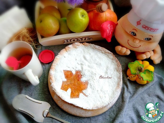 Готовый остывший пирог присыпаем сахарной пудрой, выложив трафарет листа. Убираем аккуратно трафарет. Получилась осенняя красота!