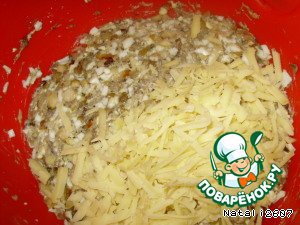Натереть сыр на терке и добавить к начинке, посолить, поперчить и перемешать.