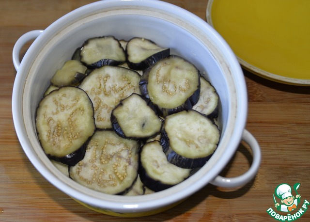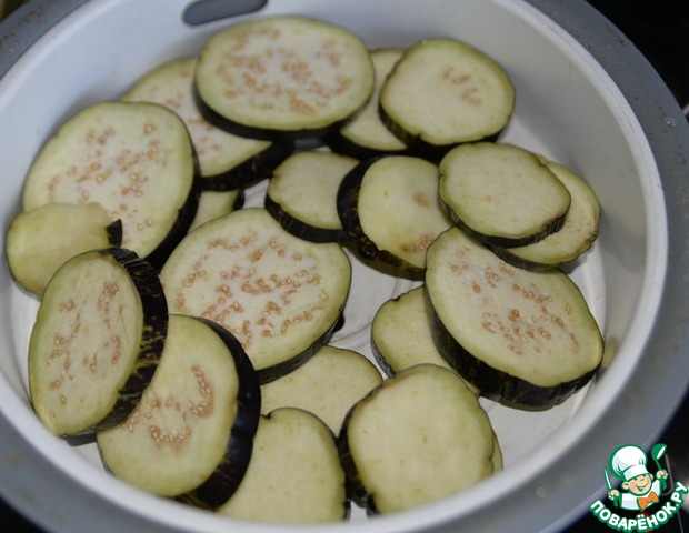 Баклажан моем, режем кружками и готовим на пару до полу-готовности. Я для этого сверху кастрюли с картофелем поставила вставку от мультиварки для варки на пару, можно положить дуршлаг. Готовим баклажаны 10 минут.