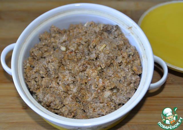 Берём любой фарш по наличию и вкусу. У меня остатки индюшиного, перекрученного с луком и морковью.