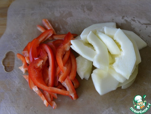 Перец и кабачок чистим. Перец режем полосками, кабачок небольшими кусочками. Если кабачок (цуккини), то кружками или полу-кружками.