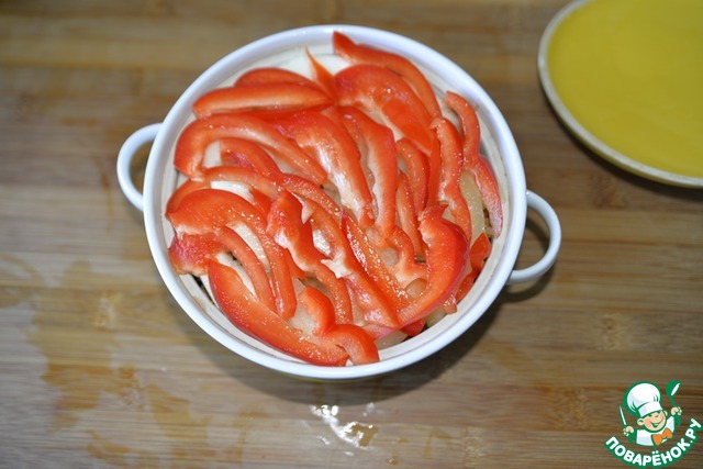 На фарш кладём слой цуккини и сверху полоски перца. Слегка подсаливаем, сбрызгиваем маслом, посыпаем орегано. Ставим в духовку на 200 градусов на 30 минут, не закрываем.