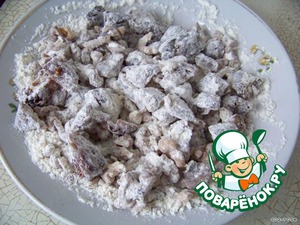 Добавляем к ним 2 стол. ложки муки, все тщательно перемешиваем (иначе в процессе приготовления теста финики слипнутся в один комок).