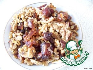 Финики режем, грецкие орехи ломаем на кусочки.