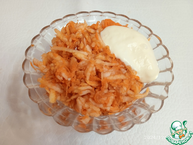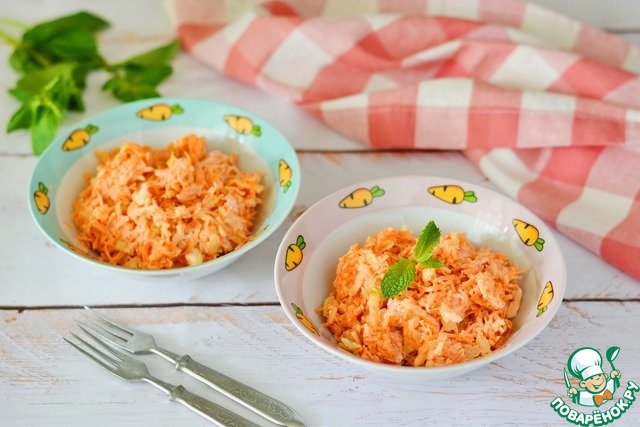 Не знаю почему так называется этот салат, может потому что дети его едят с удовольствием. Готовлю его давно, обычно зимой, салат получается сочный, нежный на вкус и главное витаминный. Когда поставите салат на стол, то вы увидете, как из салата выпрыгивают витамины, так их много.