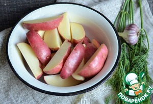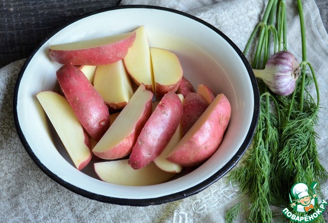 Картофель вымыть, нарезать дольками, залить кипятком, варить 5 минут. Затем откинуть на сите.