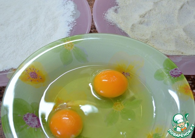 В три тарелки насыпать муку, разбить и смешать яйца, панировочные сухари + манная крупа.