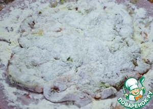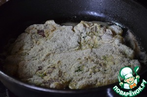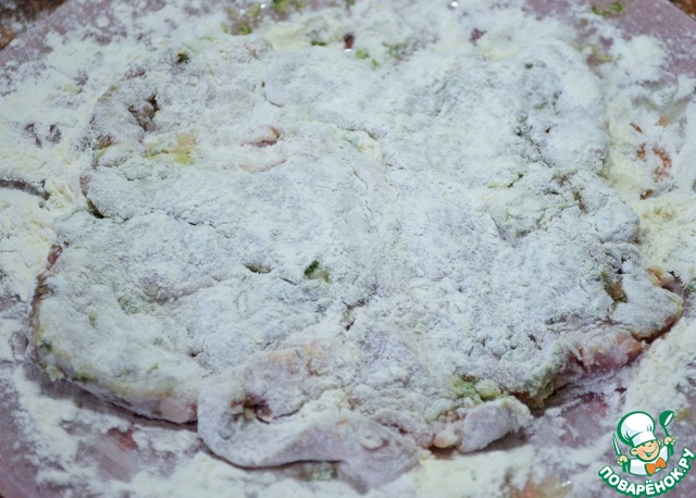 С мяса снять излишки маринада, обсыпать обильно мукой. -