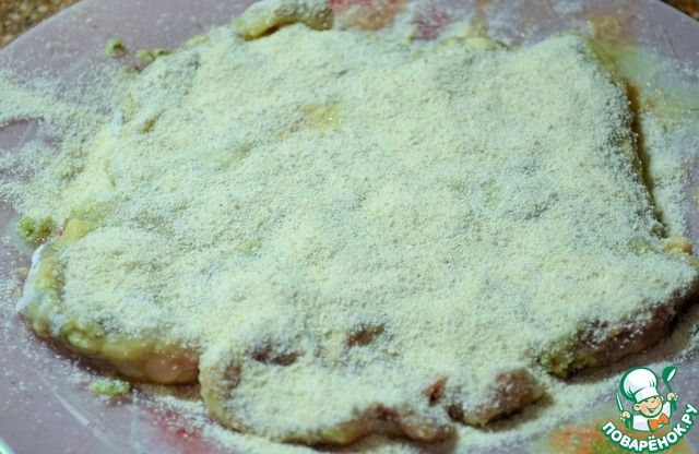 Окунуть в яйцо, запанировать в сухарно-манной смеси.