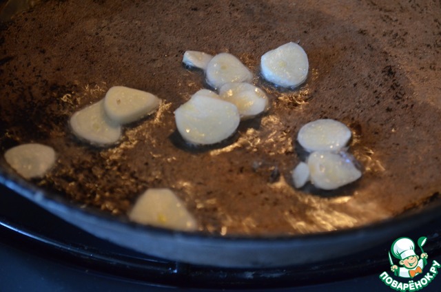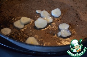 Пока жарятся отбивные, в сковороде обжарить пластинки чеснока, затем дольки отваренного картофеля.