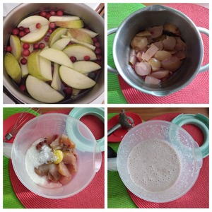 Когда я варю компот из сезонных фруктов и яблок просто попить, а не для заготовки, я всегда в него отжимаю немного лимонного сока. Довожу воду с фруктами до кипения, отжимаю сок, снимаю с огня, накрываю крышкой и даю настояться. Компот выпит и остаются фрукты. Я иногда их использую в тесто для пирога или как сегодня - для блинов. Жидкость с фруктов нужно слить по максимуму. Отправляем в посуду, кладём сахар, яйцо, кефир и разрыхлитель, соединяем погружным блендером (измельчителем), чтобы разбить все фрукты в однородную массу. Ждём реакции от кефира с разрыхлителем.