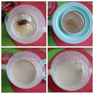 Просеиваем муку, добавляем манку, корицу, ваниль. Соединяем. Я буду использовать эл. венчик. Наливаем масло и опять соединяем. Масло нужно, чтобы не подмазывать сковороду для каждого блина. Даём тесту постоять хотя бы минут 5, чтобы манка разбухла. Тесто готово. Оно не жидкое, довольно густоё - для толстых блинов.